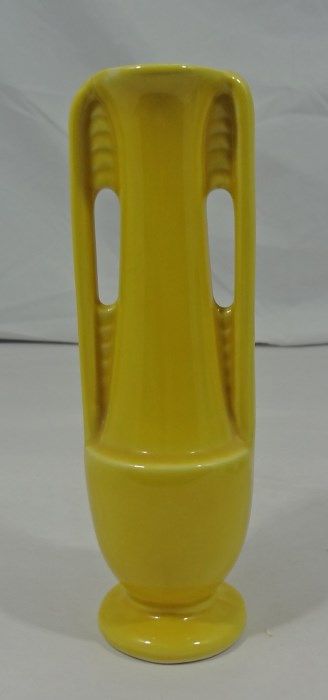 Unsigned Yellow Art Deco Pottery Vase measures 8" tall and 2" in diameter. This piece is in great condition! Est Value $10.00-20.00