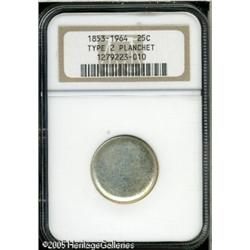 <B>Unstruck Type Two 90% Silver Quarter Planchet, Ungraded NGC.</B></I> A bright planchet with raised rims and a few freckles of honey patina. The surfaces are typically marked, and a diagonal pinscratch is noted on the upper right reverse (relative to the NGC holder).<BR><I>From The Lonnie Gray Collection of Error Coins.</B></I>    Lot:10996