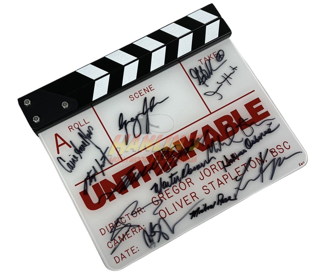 Cast signed clapperboard including stars Samuel L. Jackson and Carrie-Anne Moss for the Gregor Jordan directed thriller film 'Unthinkable' (2010), noteworthy for the controversy it generated around its subject matter, the torture of a man who threatens to detonate three nuclear bombs in three U.S. cities.