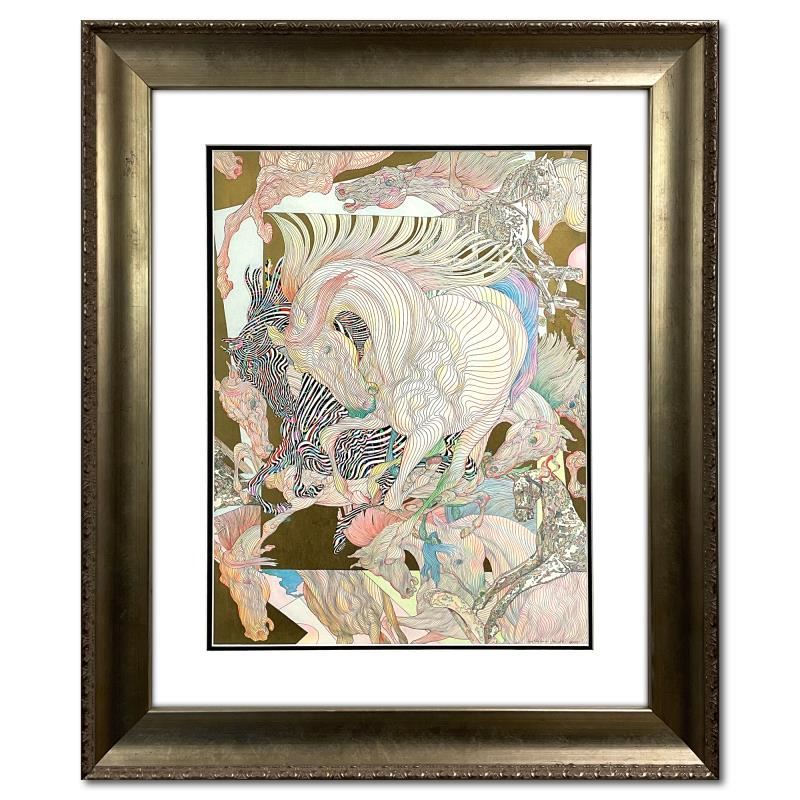 This is an hand colored original drawing on paper with hand laid gold leaf by Guillaume Azoulay, hand signed by the artist. This piece comes custom framed. Includes Letter of Authenticity. Measures approx. 29" x 26" (frame), 19" x 16" (image).
