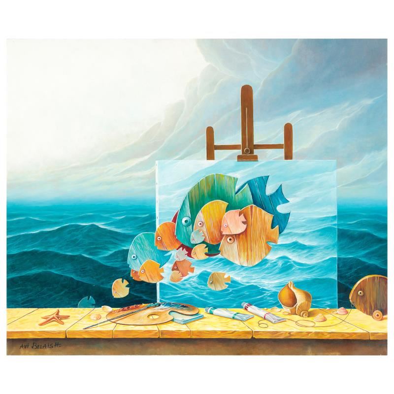 This is an original acrylic painting on stretched canvas by Avi Belaish, hand signed by the artist. Includes Letter of Authenticity. Measures approx. 40" x 48" (image). There is minor wear on the corners and edges that may be concealed when framed.