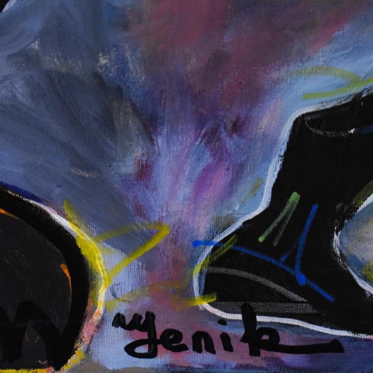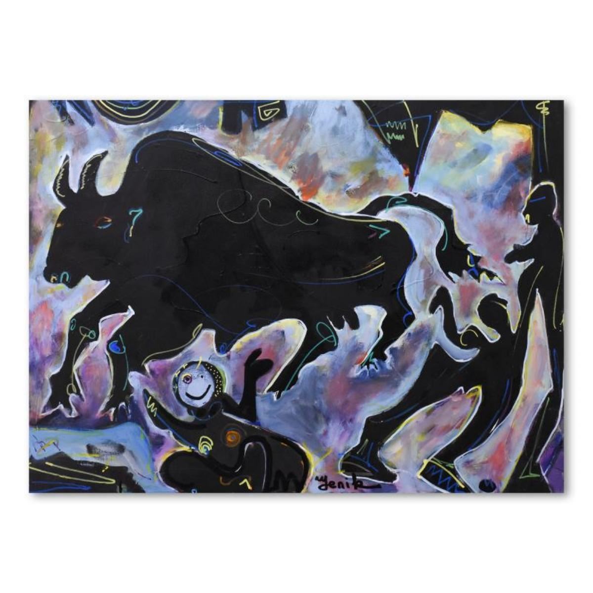 This is an original acrylic painting on gallery wrapped canvas by Jenik Cook, hand signed by the artist. Includes Letter of Authenticity. This piece comes from the artist's personal collection. Measures approx. 40" x 30" (image). There is some wear on the corners and edges of this piece.