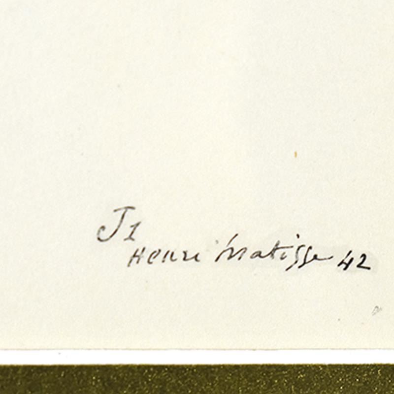 This is a lithograph by Henri Matisse (1869-1954), dated 1942 and bearing the plate signature of the artist. This piece comes custom framed. Includes Letter of Authenticity. Measures approx. 16" x 19.5"(frame), 9" x 12" (image).