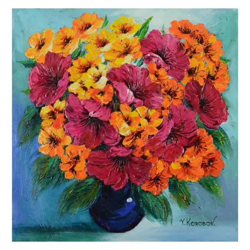 This is an original acrylic painting on canvas by Yana Korobov, hand signed by the artist. Includes Letter of Authenticity. Measures approx. 30" x 30" (image).