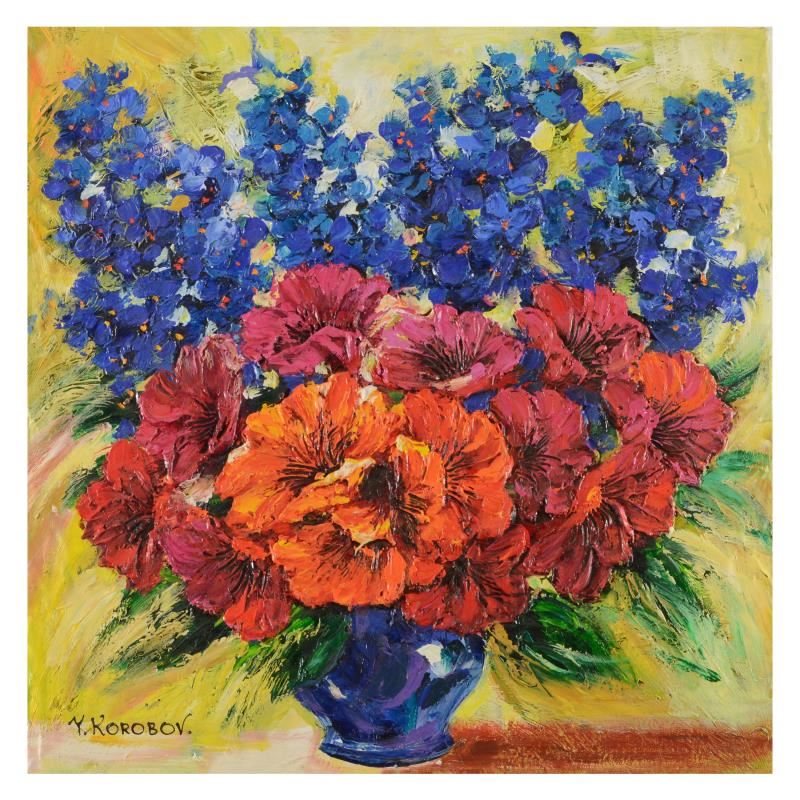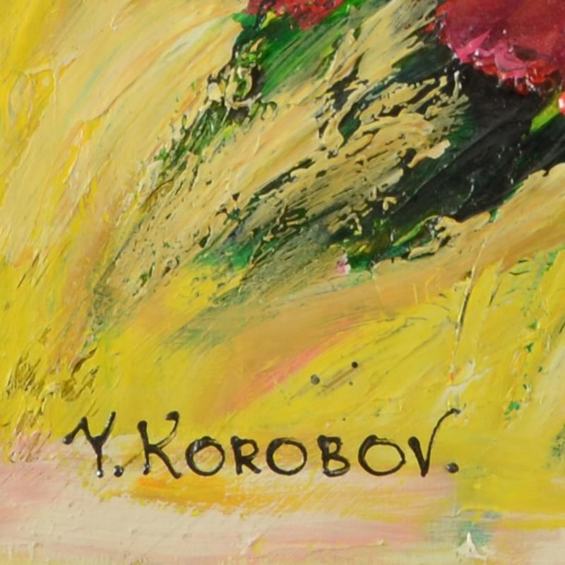 This is an original acrylic painting on canvas by Yana Korobov, hand signed by the artist. Includes Letter of Authenticity. Measures approx. 30" x 30" (image).
