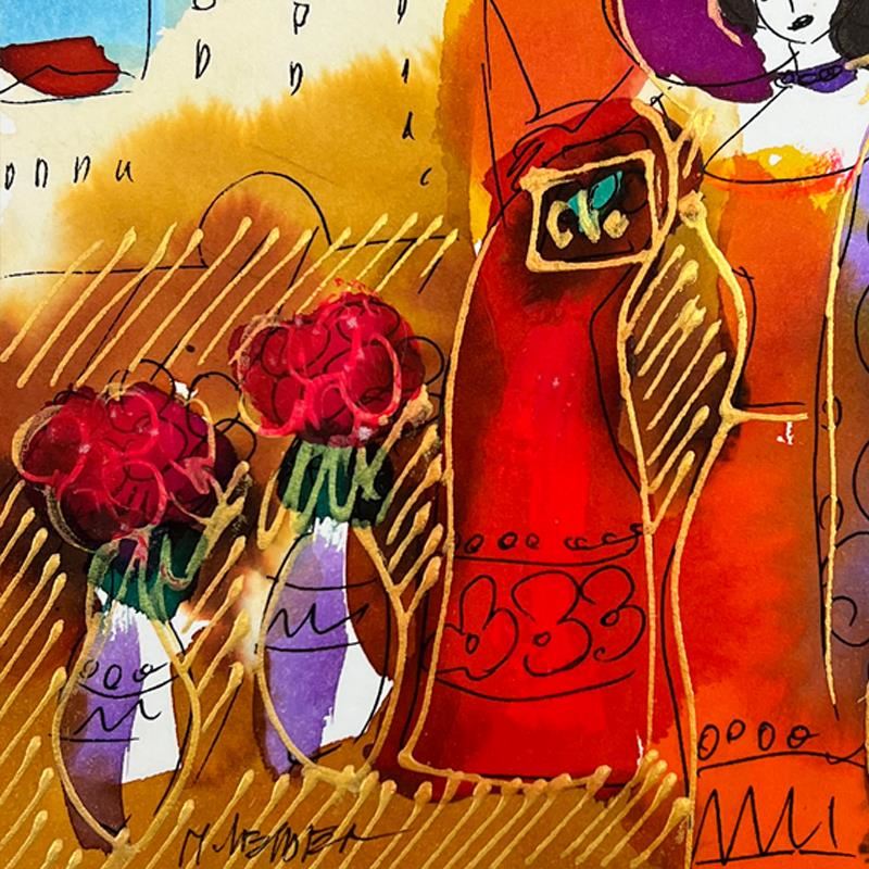 This is an original mixed media watercolor painting on paper by Moshe Leider. Hand signed by the artist, this piece comes custom framed and includes a Letter of Authenticity. Measures approximately 15" x 13.5" (frame), 8" x 6.5" (image).