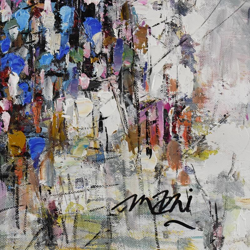 This is an original oil painting on canvas by Mani, hand signed by the artist. Includes Letter of Authenticity. Measures approx. 25" x 37" (image). This piece is double signed; once along bottom border in black, and again in silver along left-hand border.