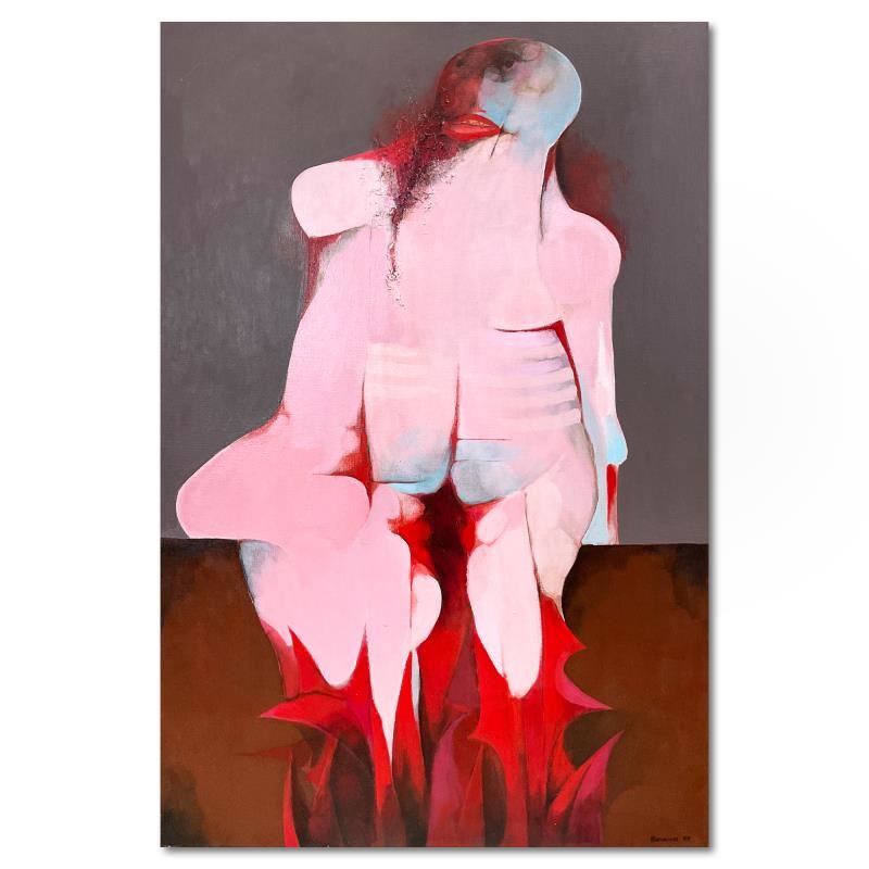 This is an original painting on stretched canvas by Milton Berwin (1925-2023), dated 1974 and hand signed by the artist. Includes Letter of Authenticity. Measures approx. 45" x 30" (image).