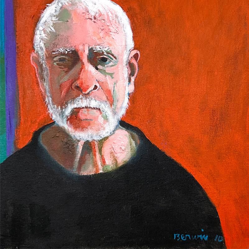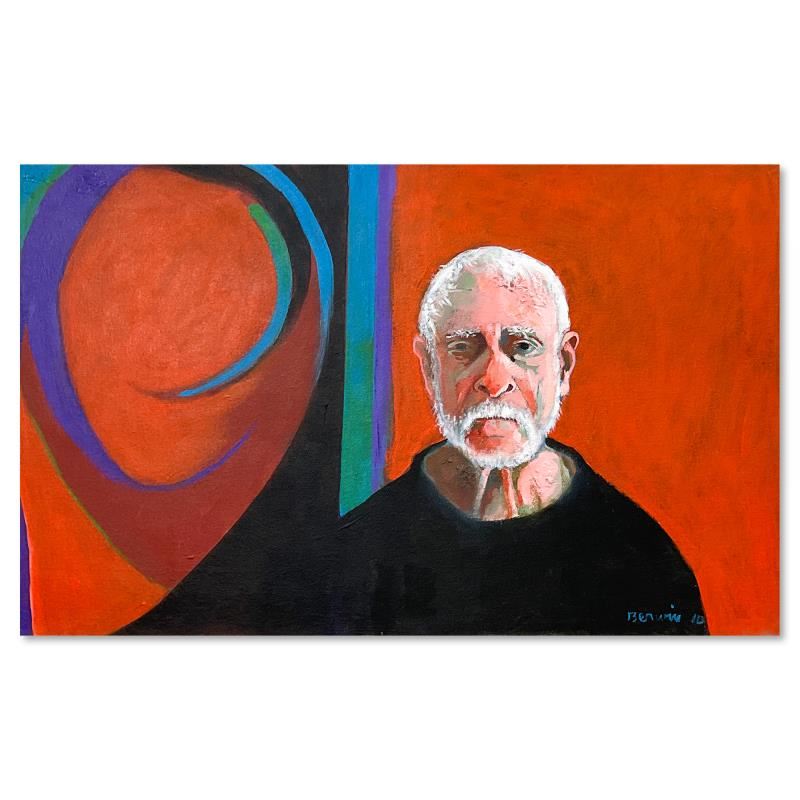 "Self Portrait" is an original painting on stretched canvas by Milton Berwin (1925-2023), hand signed by the artist. Includes Letter of Authenticity. Measures approx. 16" x 25" (image).