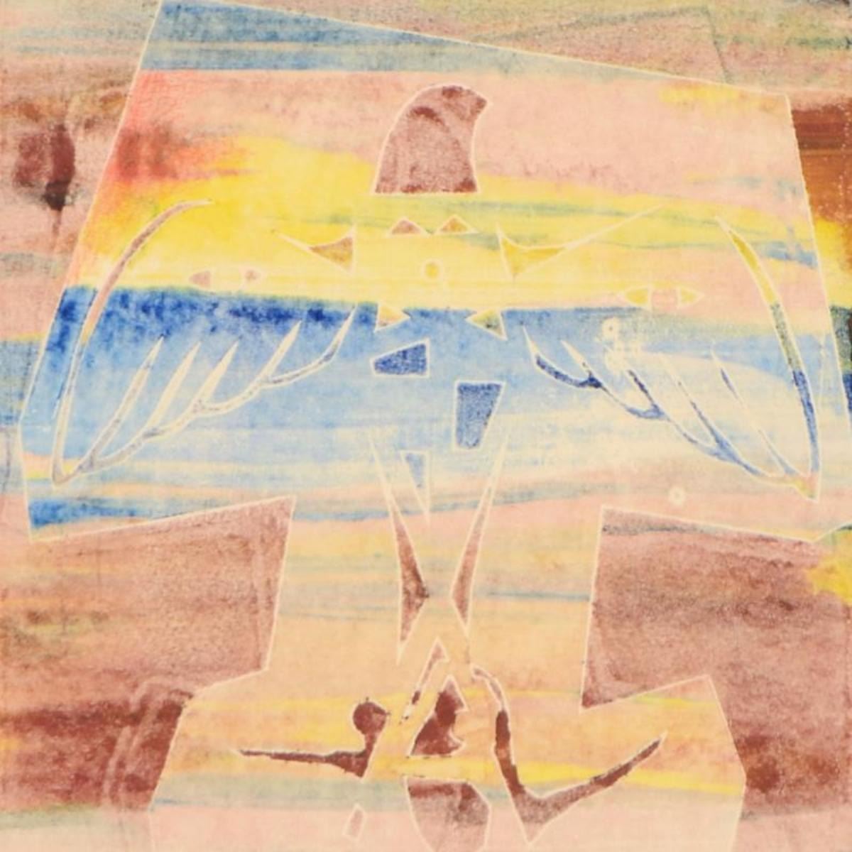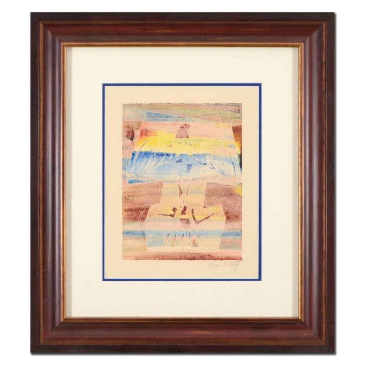 This is an original mixed media linocut on paper by Neal Doty (1941-2016), hand signed by the artist. This piece comes custom framed. Includes Certificate of Authenticity. This piece comes from Neal Doty's personal collection and was received directly from Doty's Estate. Measures approx. 23" x 26" (frame), 10" x 13" (image).