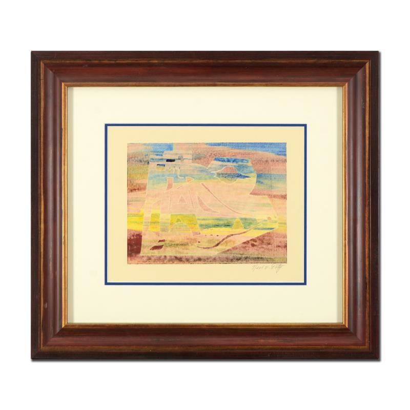 This is an original mixed media linocut on paper by Neal Doty (1941-2016), hand signed by the artist. This piece comes custom framed. Includes Certificate of Authenticity. This piece comes from Neal Doty's personal collection and was received directly from Doty's Estate. Measures approx. 26" x 23" (frame), 10" x 20" (image).