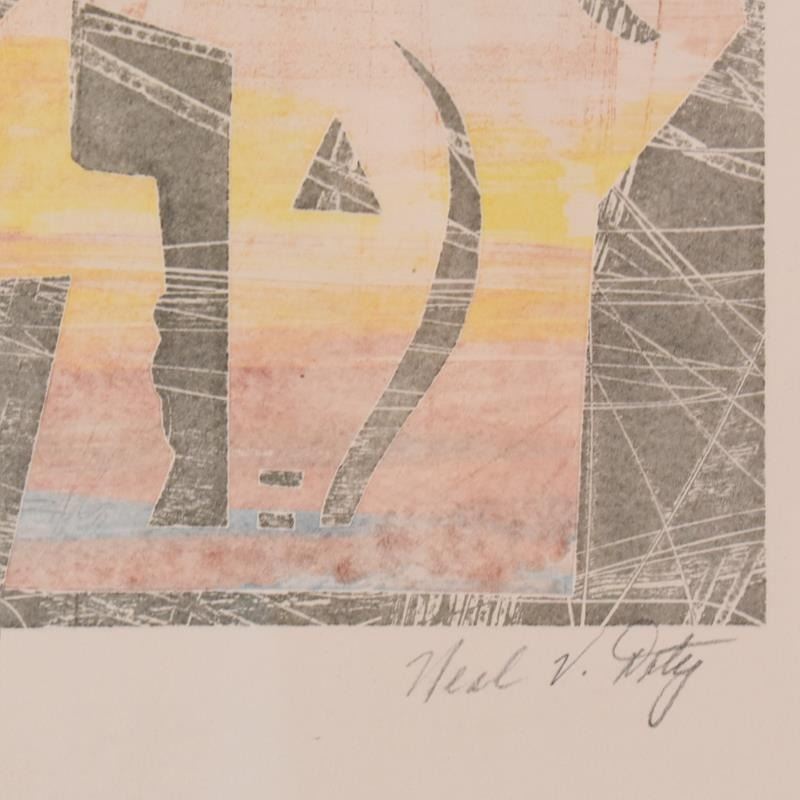 This is a one-of-a-kind mixed media on paper by Neal Doty (1941-2016), and hand signed by the artist. This piece comes custom framed. Includes Letter of Authenticity. Measures approx. 20" x 24" (frame), 9" x 12" (image).