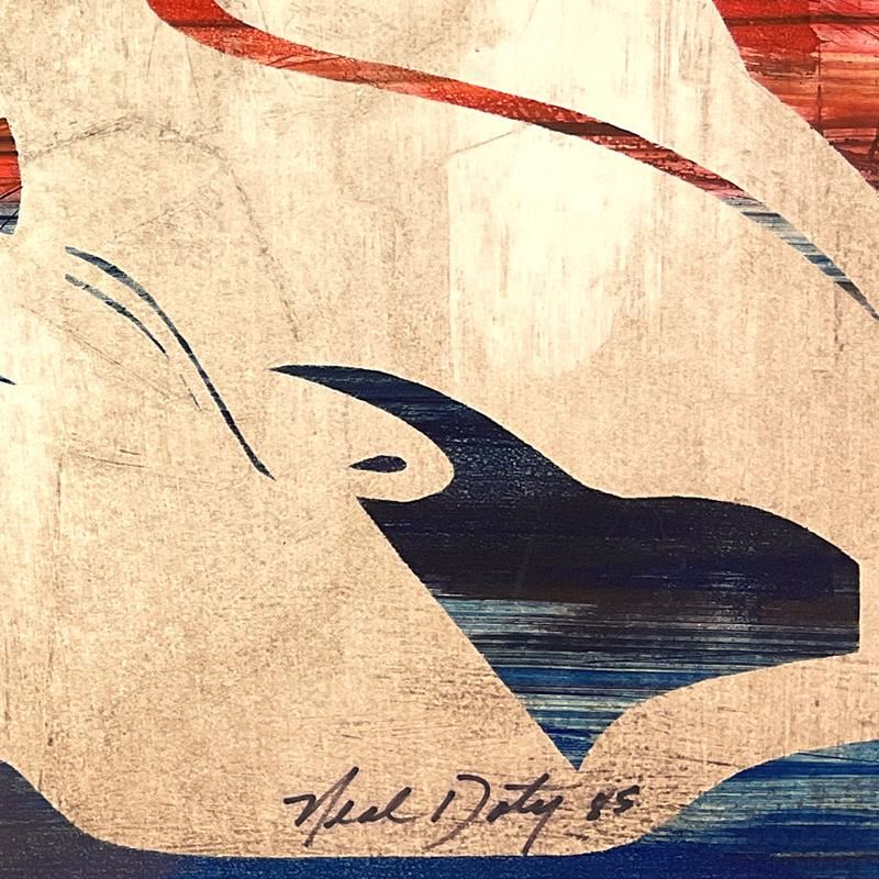 This is a one-of-a-kind mixed media linocut on paper by Neal Doty (1941-2016), hand signed by the artist. Includes Letter of Authenticity. Measures approx. 21.5" x 15.5" (image).