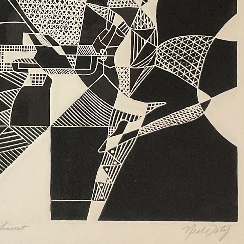 This is a one-of-a-kind linocut on paper by Neal Doty (1941-2016), hand signed by the artist. This piece comes custom framed. Includes Letter of Authenticity. Measures approx. 25" x 30.5" (frame), 16" x 21" (image).