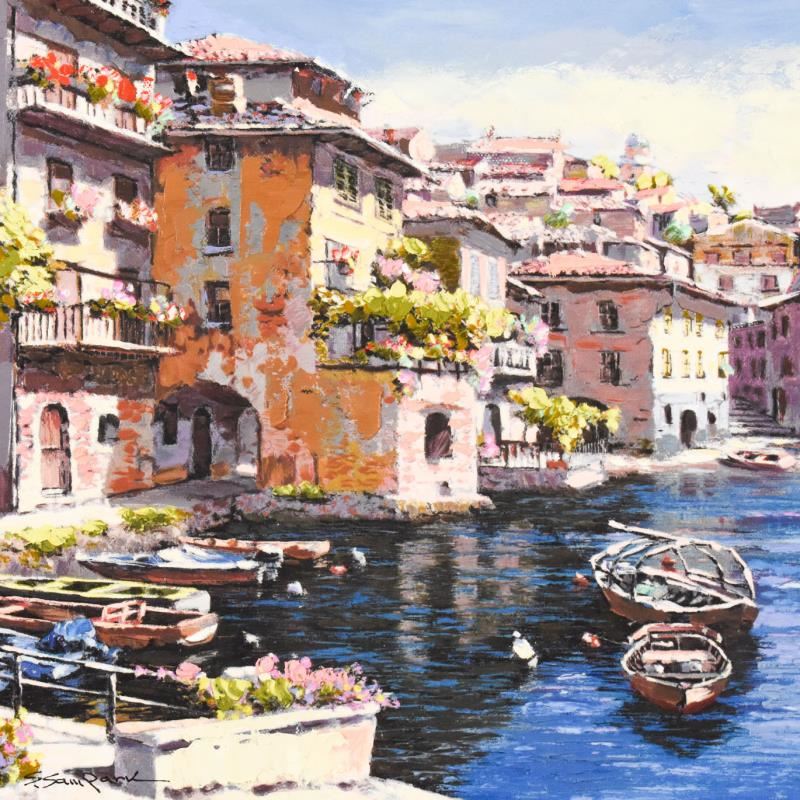 This is a hand embellished limited edition serigraph on canvas by Sam Park, numbered and hand signed by the artist. Includes Letter of Authenticity. Measures approx. 16" x 12" (image). There is minor cracking on the corners and edges that may be concealed when framed.
