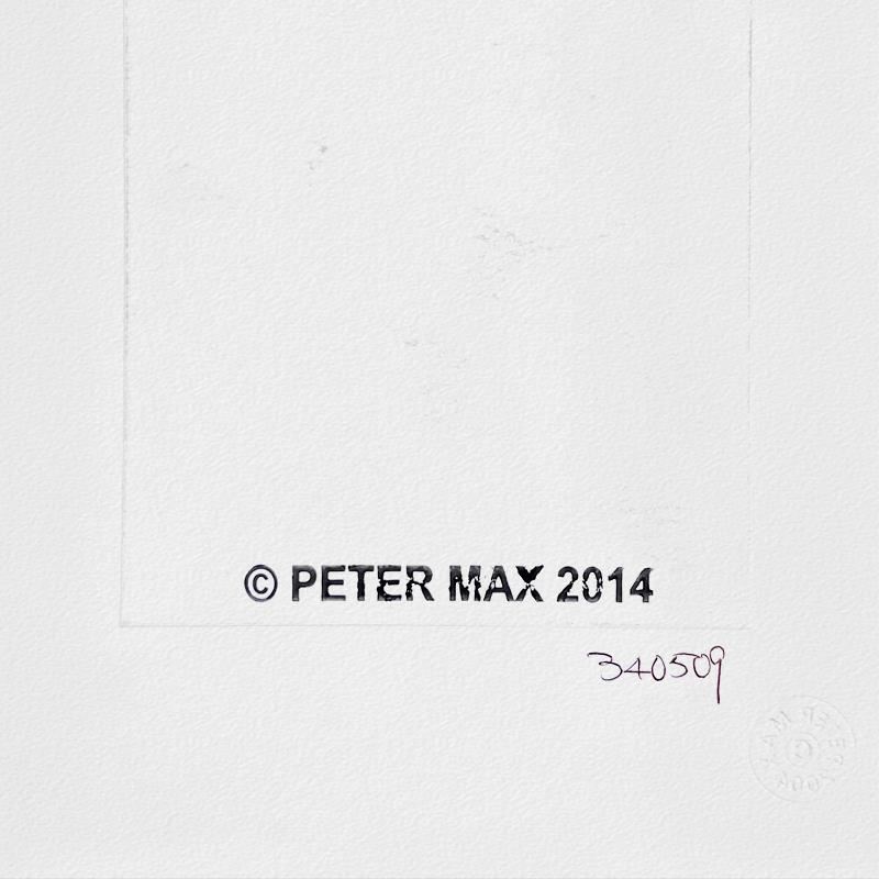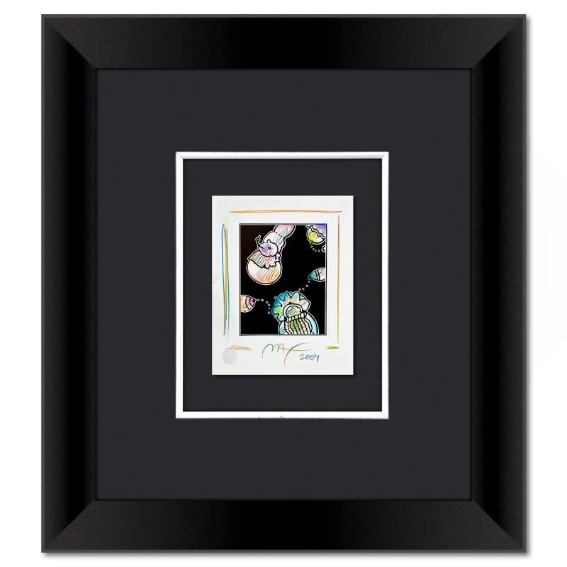 This is a one-of-a-kind mixed media on paper, hand signed by Peter Max. The piece comes custom framed with a backside cutout to display Peter Max Studio registration number 340509 certifying authenticity. Measures approximately 23 x 21 (frame), 9 x 7 (image).