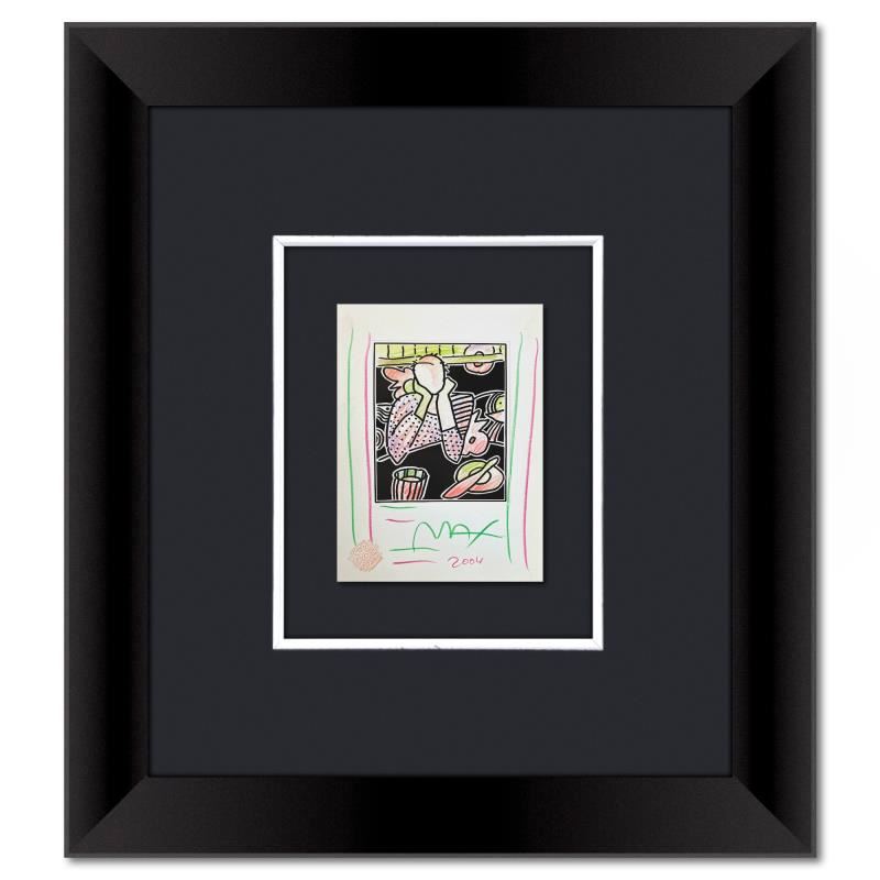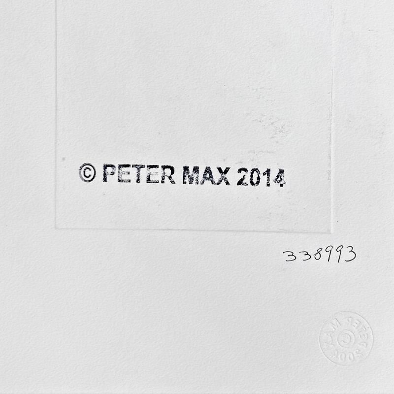 This is a one-of-a-kind mixed media on paper, hand signed by Peter Max. The piece comes custom framed with a backside cutout to display Peter Max Studio registration number 338993 certifying authenticity. Measures approximately 22.5 x 20 (frame), 8.5 x 6 (image).