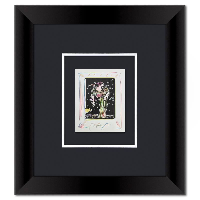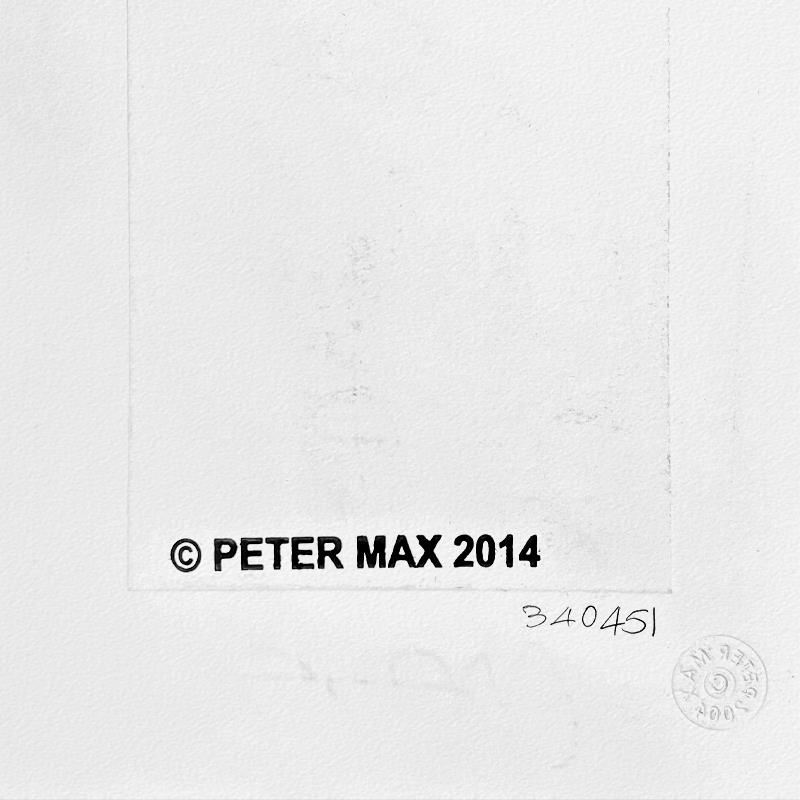 This is a one-of-a-kind mixed media on paper, hand signed by Peter Max. The piece comes custom framed with a backside cutout to display Peter Max Studio registration number 340451 certifying authenticity. Measures approximately 23 x 21 (frame), 9 x 7 (image).