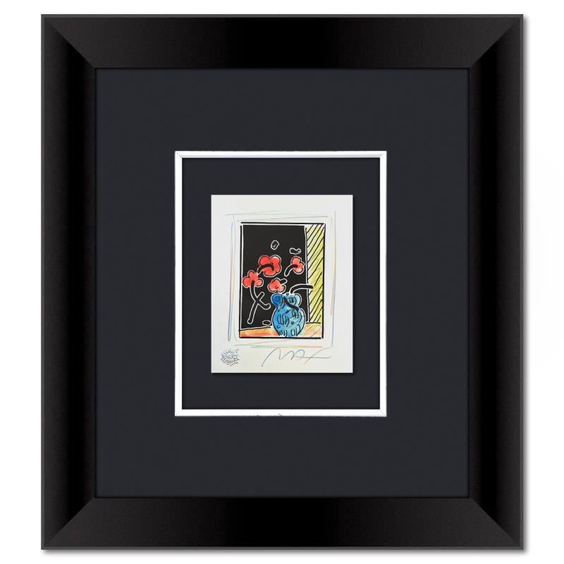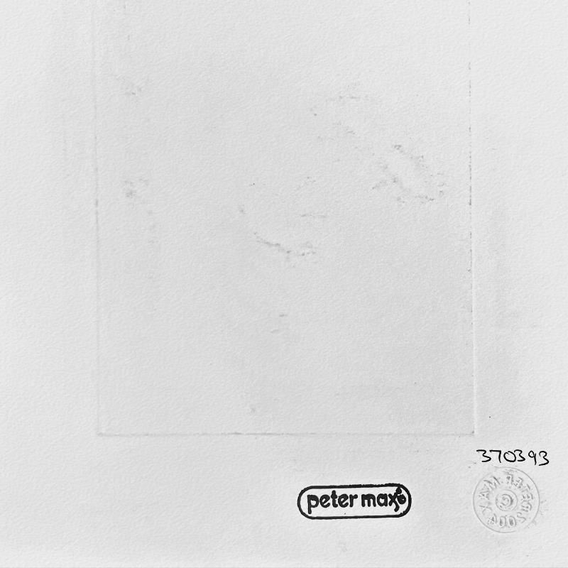 This is a one-of-a-kind mixed media on paper, hand signed by Peter Max. The piece comes custom framed with a backside cutout to display Peter Max Studio registration number 370393 certifying authenticity. Measures approximately 23 x 21 (frame), 9 x 7 (image).