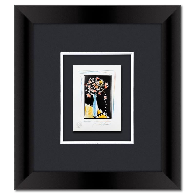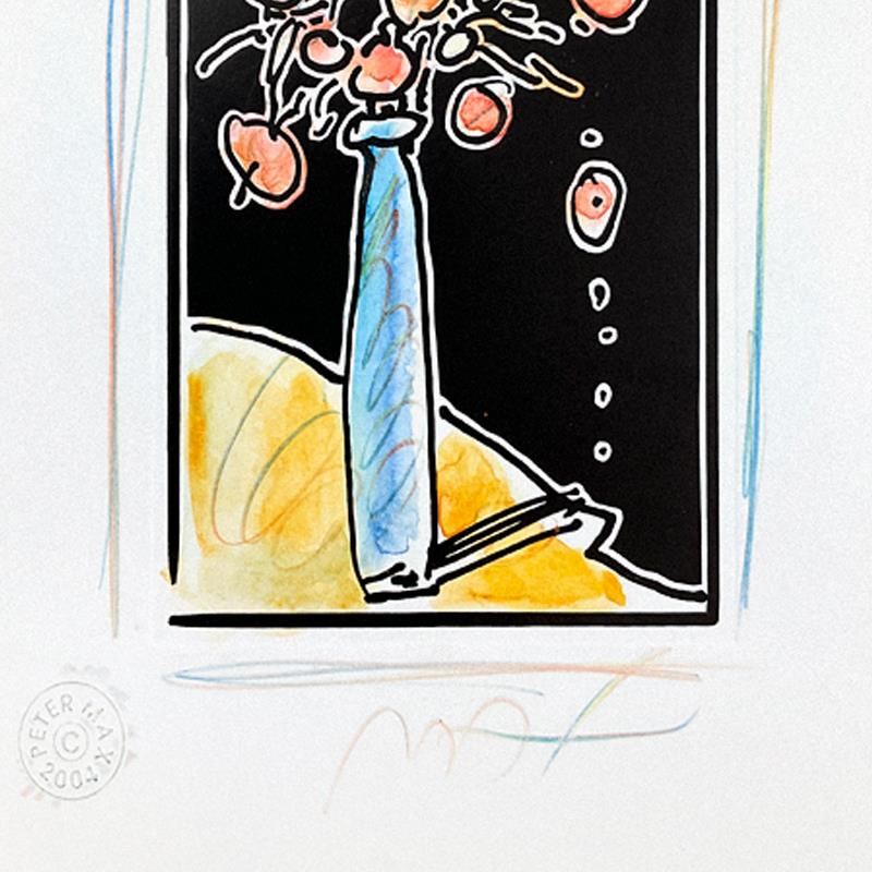 This is a one-of-a-kind mixed media on paper, hand signed by Peter Max. The piece comes custom framed with a backside cutout to display Peter Max Studio registration number 370275 certifying authenticity. Measures approx. 22.5 x 21.5 (frame), 8 x 6 (image).