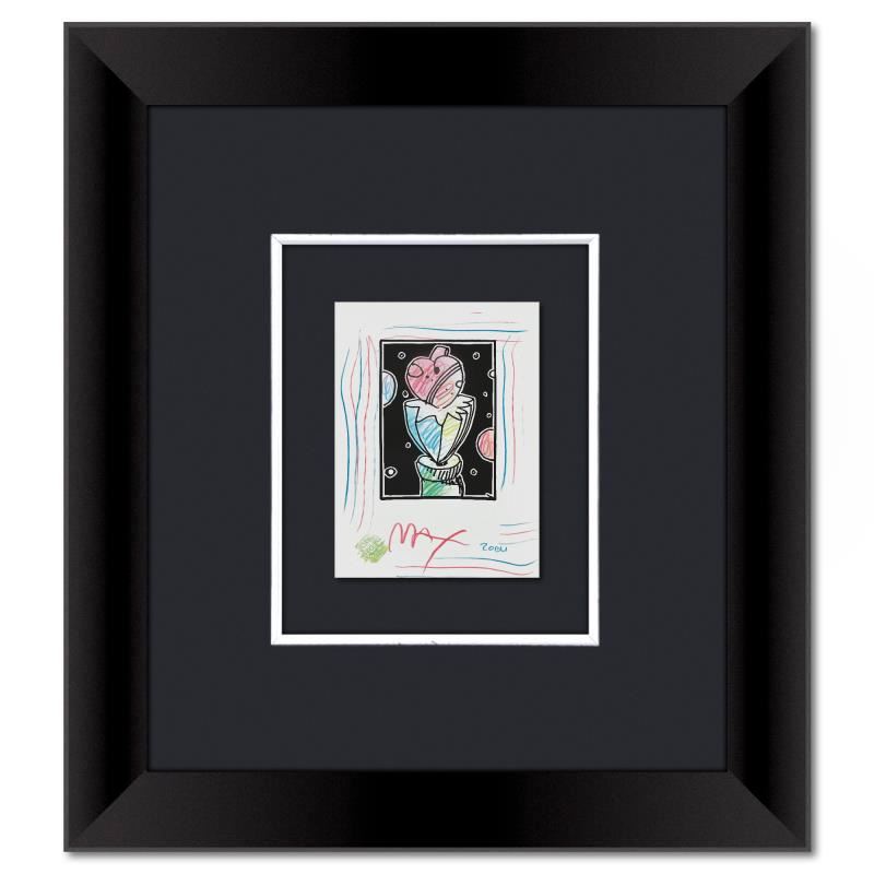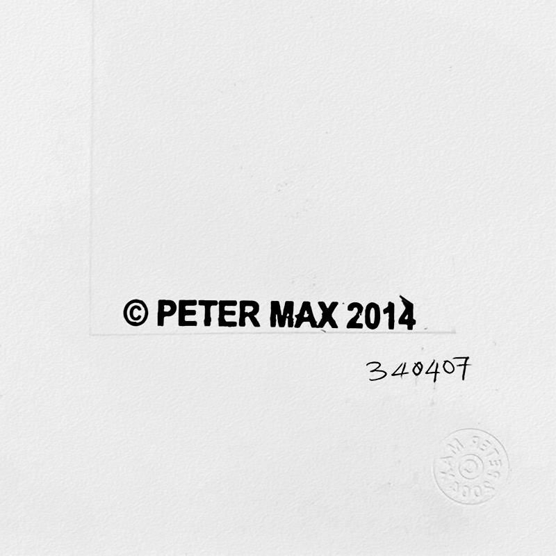 This is a one-of-a-kind mixed media on paper, hand signed by Peter Max. The piece comes custom framed with a backside cutout to display Peter Max Studio registration number 340407 certifying authenticity. Measures approximately 22.5 x 20 (frame), 8.5 x 6 (image).