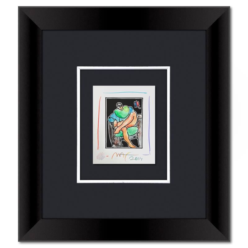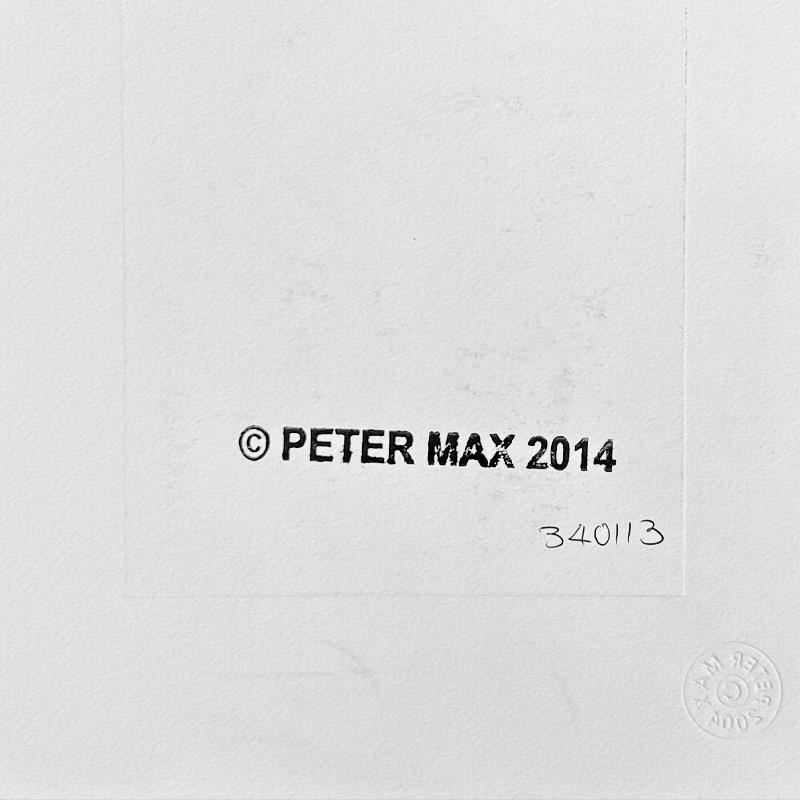 This is a one-of-a-kind mixed media on paper, hand signed by Peter Max. The piece comes custom framed with a backside cutout to display Peter Max Studio registration number 340113 certifying authenticity. Measures approximately 23" x 21" (frame), 9" x 7" (image).