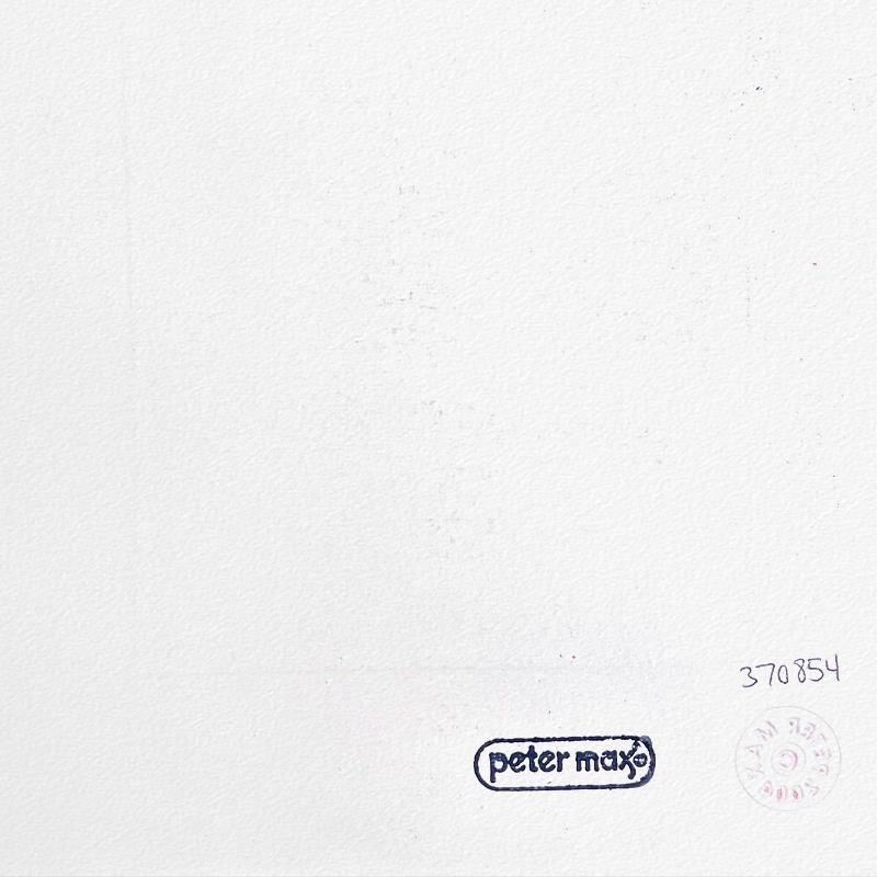This is a one-of-a-kind mixed media on paper, hand signed by Peter Max. The piece comes custom framed with a backside cutout to display Peter Max Studio registration number 370854 certifying authenticity. Measures approximately 23" x 21" (frame), 9" x 7" (image).