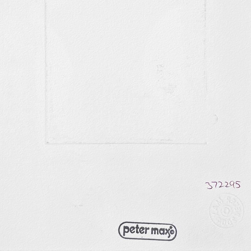 This is a one-of-a-kind mixed media on paper, hand signed by Peter Max. The piece comes custom framed with a backside cutout to display Peter Max Studio registration number 372295 certifying authenticity. Measures approximately 22.5" x 20" (frame), 8.5" x 6" (image).