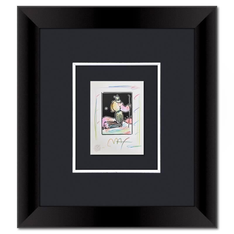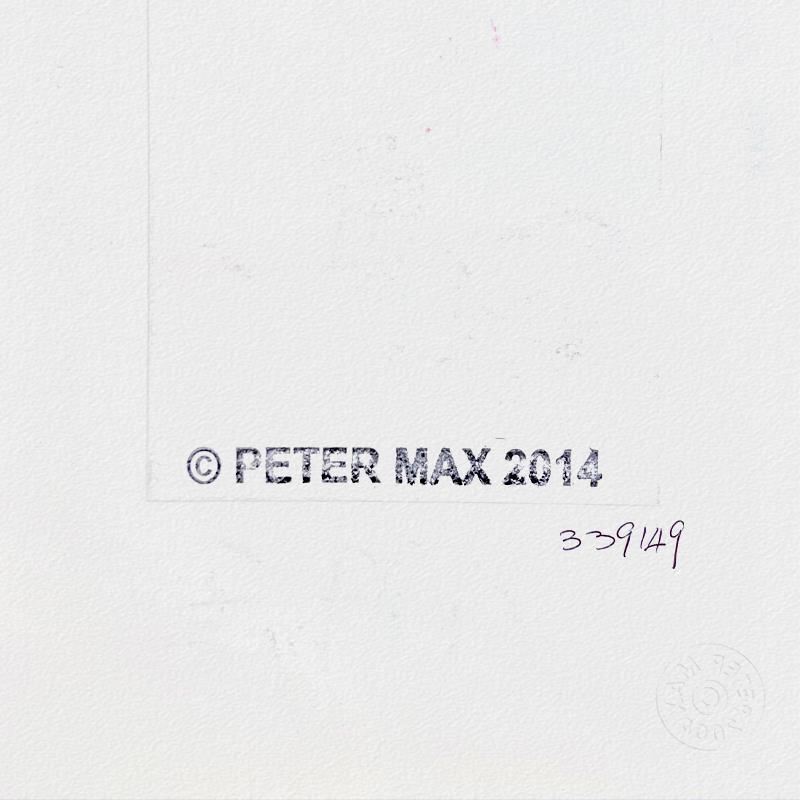 This is a one-of-a-kind mixed media on paper, hand signed by Peter Max. The piece comes custom framed with a backside cutout to display Peter Max Studio registration number 339149 certifying authenticity. Measures approximately 22.5" x 20" (frame), 8.5" x 6" (image).