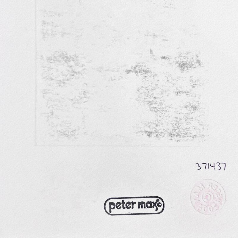 This is a one-of-a-kind mixed media on paper, hand signed by Peter Max. The piece comes custom framed with a backside cutout to display Peter Max Studio registration number 371437 certifying authenticity. Measures approximately 22.5" x 20" (frame), 8.5" x 6" (image).
