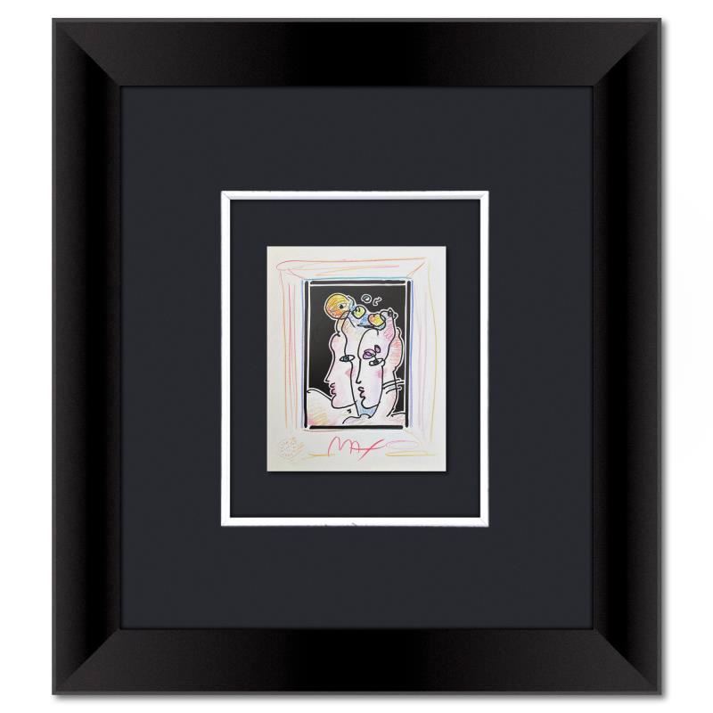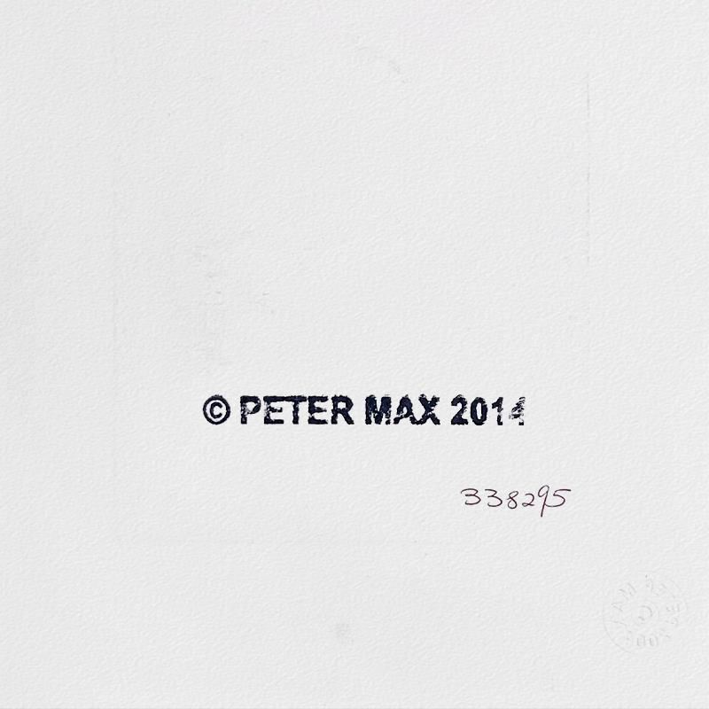 This is a one-of-a-kind mixed media on paper, hand signed by Peter Max. The piece comes custom framed with a backside cutout to display Peter Max Studio registration number 338295 certifying authenticity. Measures approximately 23" x 21" (frame), 9" x 7" (image).
