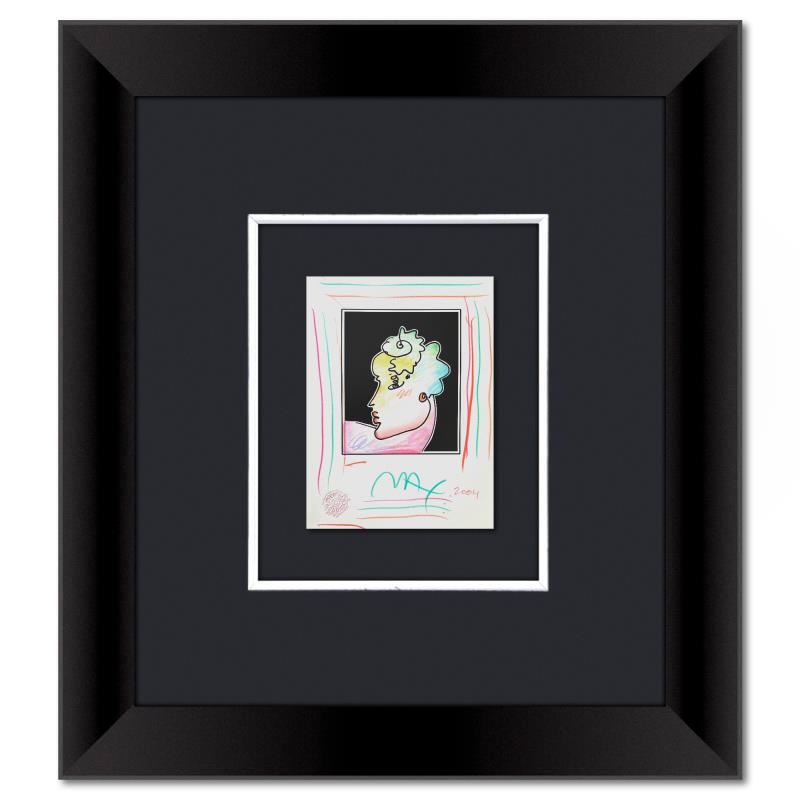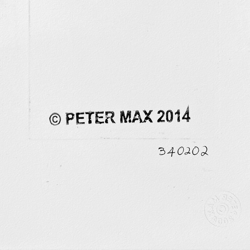 This is a one-of-a-kind mixed media on paper, hand signed by Peter Max. The piece comes custom framed with a backside cutout to display Peter Max Studio registration number 340202 certifying authenticity. Measures approximately 22.5" x 20" (frame), 8.5" x 6" (image).