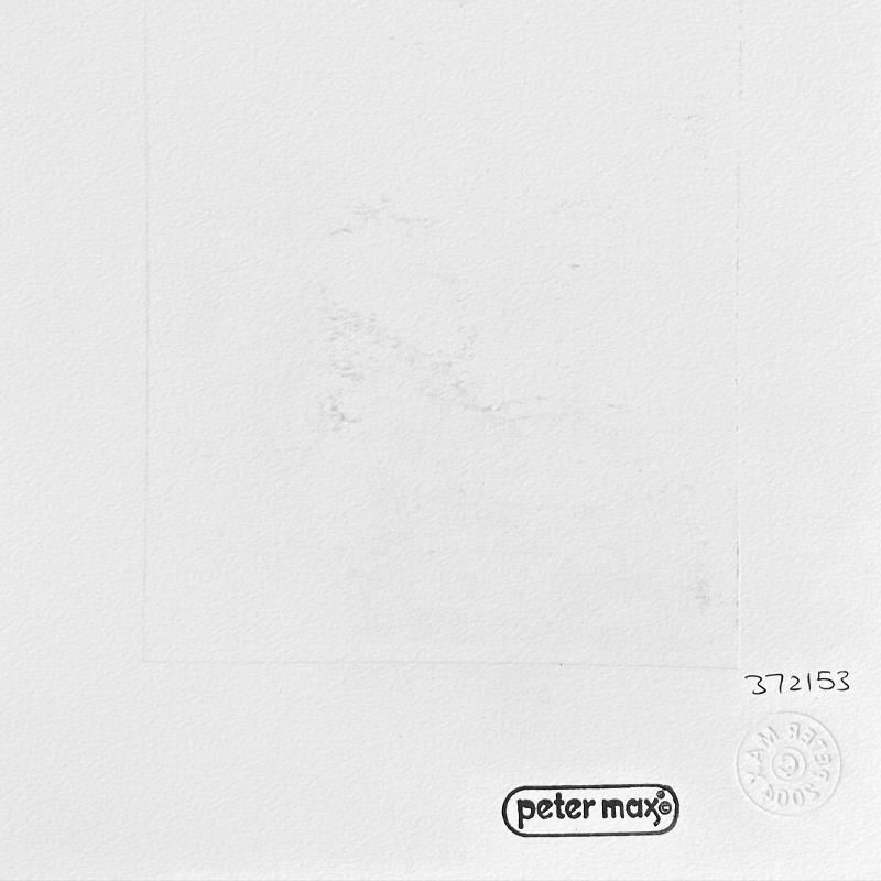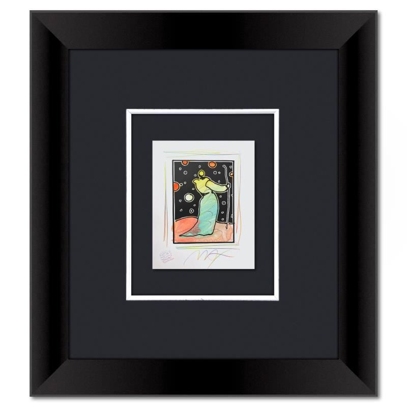 This is a one-of-a-kind mixed media on paper, hand signed by Peter Max. The piece comes custom framed with a backside cutout to display Peter Max Studio registration number 372153 certifying authenticity. Measures approximately 23" x 21" (frame), 9" x 7" (image). This item requires special handling and may have a longer than usual turnaround.