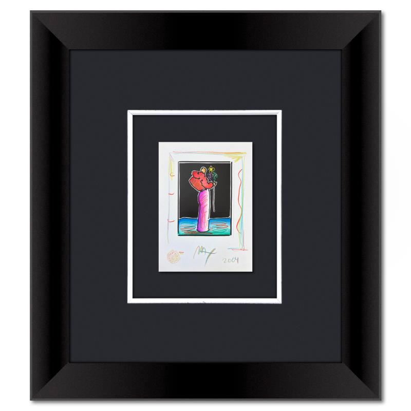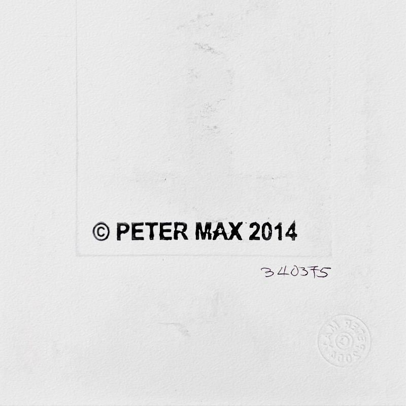 This is a one-of-a-kind mixed media on paper, hand signed by Peter Max. The piece comes custom framed with a backside cutout to display Peter Max Studio registration number 340375 certifying authenticity. Measures approximately 22.5" x 20" (frame), 8.5" x 6" (image). This item requires special handling and may have a longer than usual turnaround.