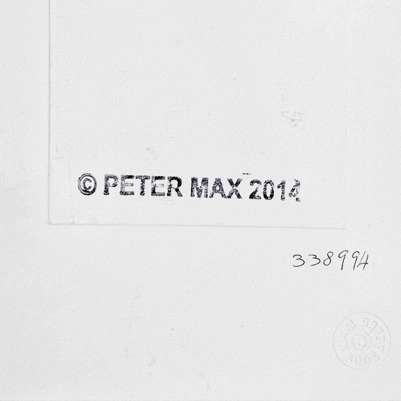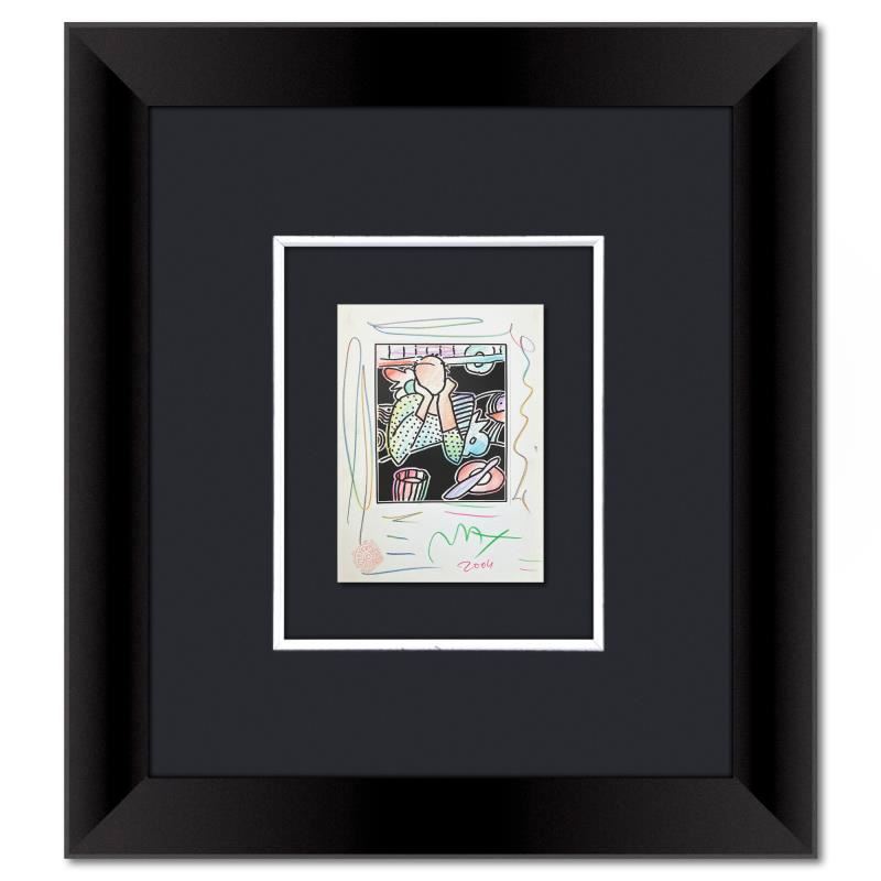 This is a one-of-a-kind mixed media on paper, hand signed by Peter Max. The piece comes custom framed with a backside cutout to display Peter Max Studio registration number 338994 certifying authenticity. Measures approximately 22.5" x 20" (frame), 8.5" x 6" (image). This item requires special handling and may have a longer than usual turnaround.
