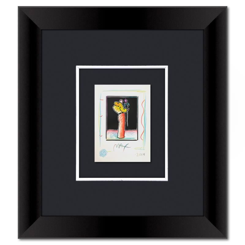This is a one-of-a-kind mixed media on paper, hand signed by Peter Max. The piece comes custom framed with a backside cutout to display Peter Max Studio registration number 340376 certifying authenticity. Measures approximately 22.5" x 20" (frame), 8.5" x 6" (image). This item requires special handling and may have a longer than usual turnaround.