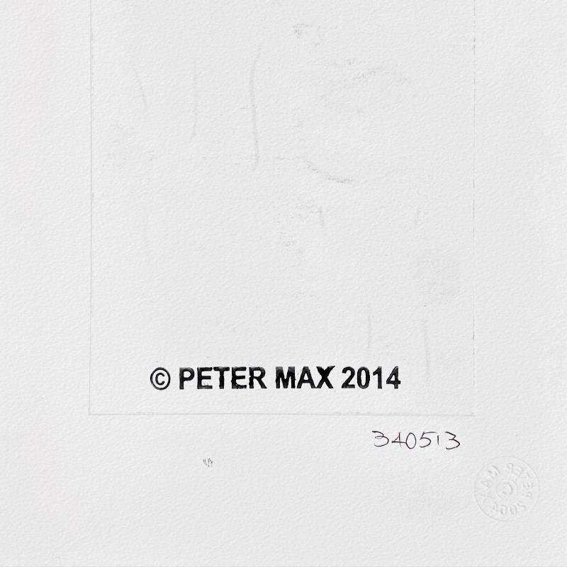 This is a one-of-a-kind mixed media on paper, hand signed by Peter Max. The piece comes custom framed with a backside cutout to display Peter Max Studio registration number 340513 certifying authenticity. Measures approximately 23" x 21" (frame), 9" x 7" (image). This item requires special handling and may have a longer than usual turnaround.