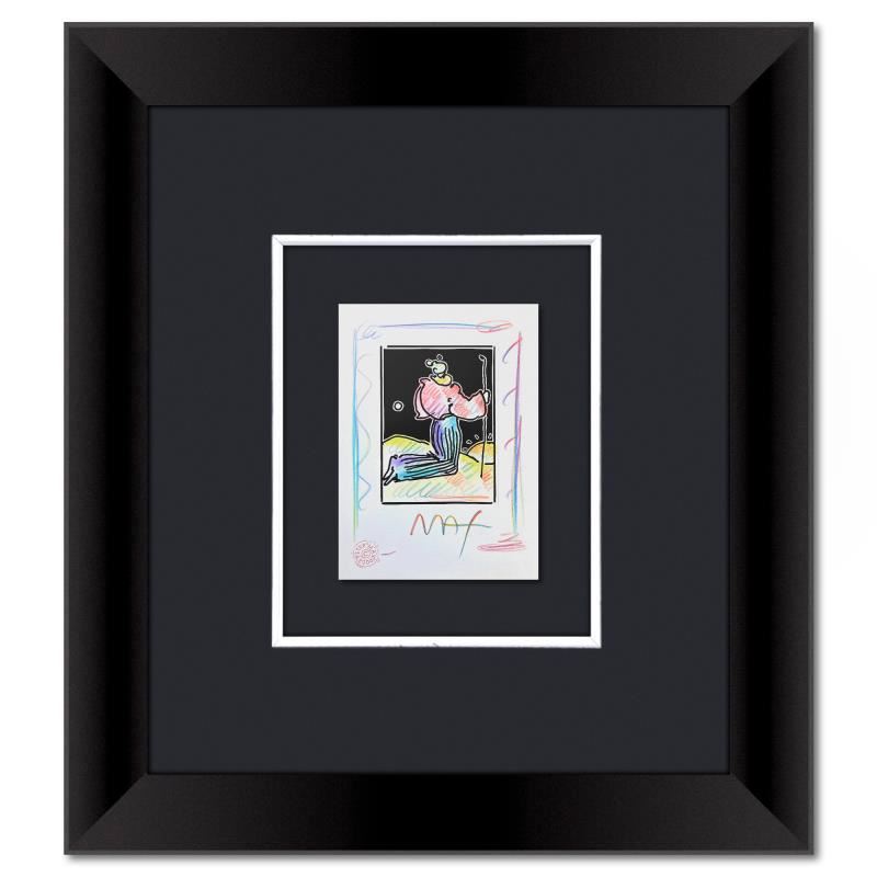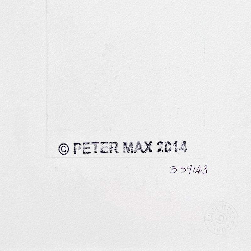 This is a one-of-a-kind mixed media on paper, hand signed by Peter Max. The piece comes custom framed with a backside cutout to display Peter Max Studio registration number 339148 certifying authenticity. Measures approximately 22.5" x 20" (frame), 8.5" x 6" (image). This item requires special handling and may have a longer than usual turnaround.