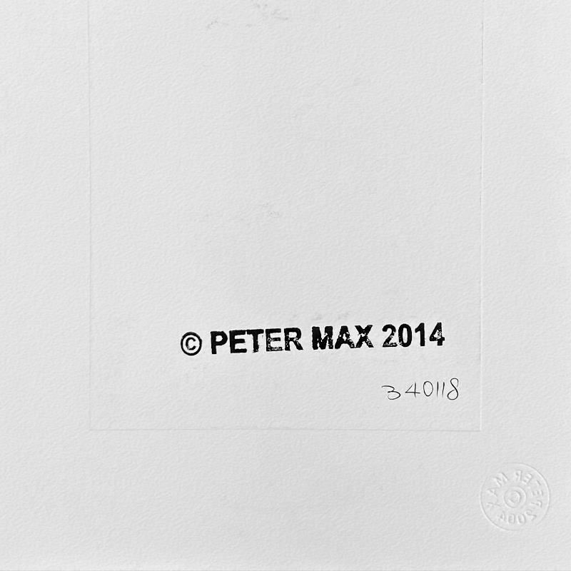 This is a one-of-a-kind mixed media on paper, hand signed by Peter Max. The piece comes custom framed with a backside cutout to display Peter Max Studio registration number 340118 certifying authenticity. Measures approximately 23" x 21" (frame), 9" x 7" (image). This item requires special handling and may have a longer than usual turnaround.