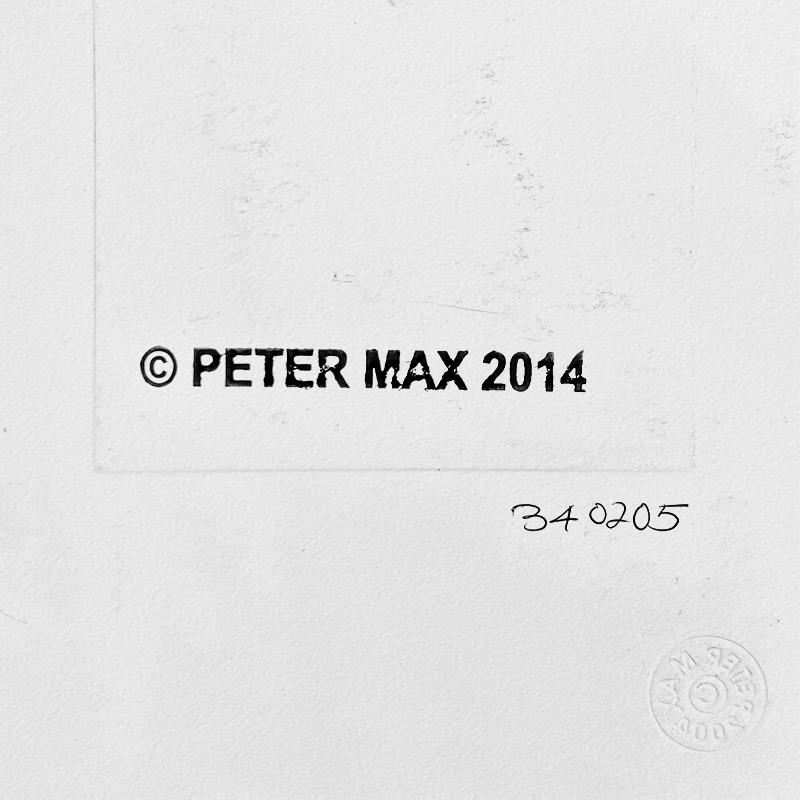 This is a one-of-a-kind mixed media on paper, hand signed by Peter Max. The piece comes custom framed with a backside cutout to display Peter Max Studio registration number 340205 certifying authenticity. Measures approximately 22.5" x 20" (frame), 8.5" x 6" (image). This item requires special handling and may have a longer than usual turnaround.