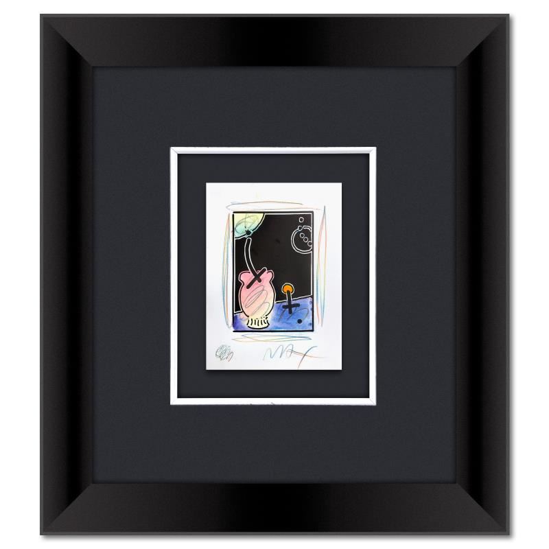 This is a one-of-a-kind mixed media on paper, hand signed by Peter Max. The piece comes custom framed with a backside cutout to display Peter Max Studio registration number 370492 certifying authenticity. Measures approx. 22.5" x 21.5" (frame), 8" x 6" (image). This item requires special handling and may have a longer than usual turnaround.