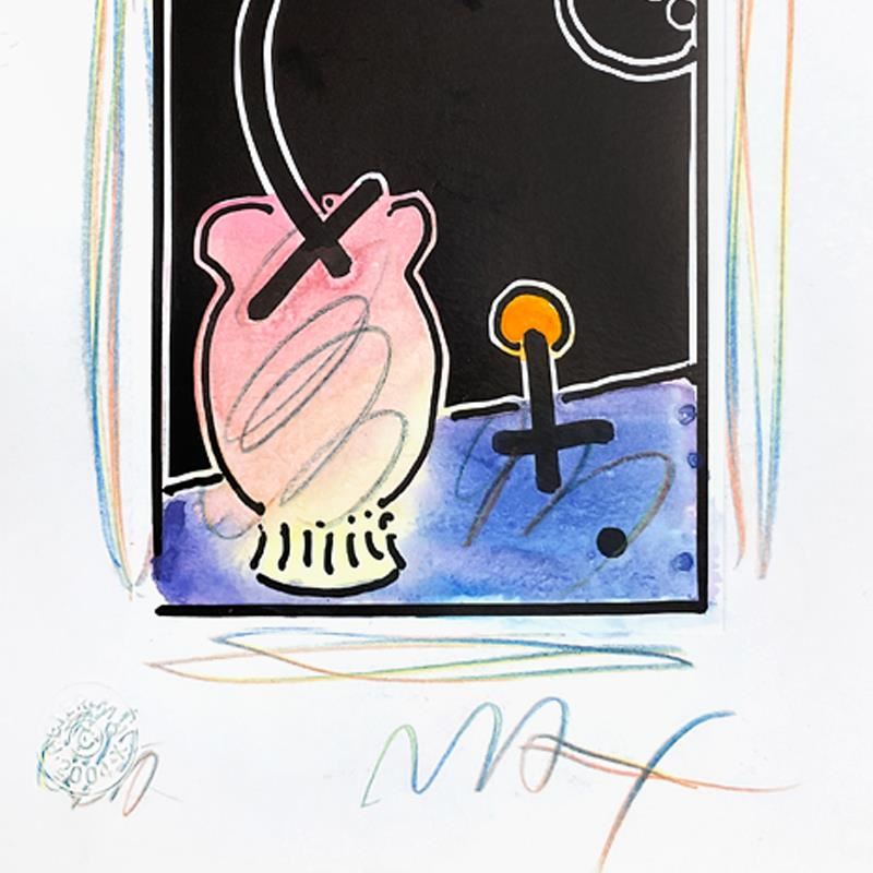 This is a one-of-a-kind mixed media on paper, hand signed by Peter Max. The piece comes custom framed with a backside cutout to display Peter Max Studio registration number 370492 certifying authenticity. Measures approx. 22.5" x 21.5" (frame), 8" x 6" (image). This item requires special handling and may have a longer than usual turnaround.