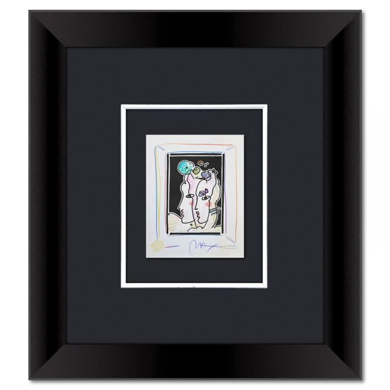 This is a one-of-a-kind mixed media on paper, hand signed by Peter Max. The piece comes custom framed with a backside cutout to display Peter Max Studio registration number 338299 certifying authenticity. Measures approximately 23" x 21" (frame), 9" x 7" (image). This item requires special handling and may have a longer than usual turnaround.