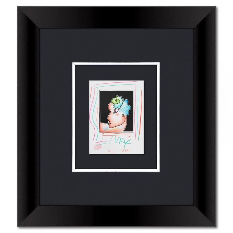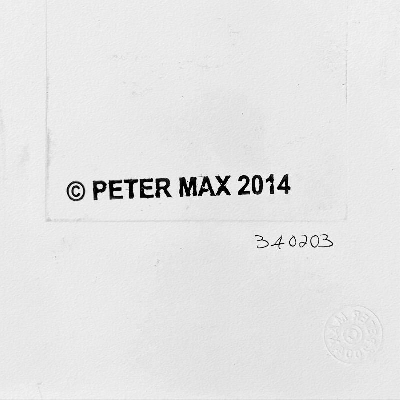 This is a one-of-a-kind mixed media on paper, hand signed by Peter Max. The piece comes custom framed with a backside cutout to display Peter Max Studio registration number 340203 certifying authenticity. Measures approximately 22.5" x 20" (frame), 8.5" x 6" (image). This item requires special handling and may have a longer than usual turnaround.