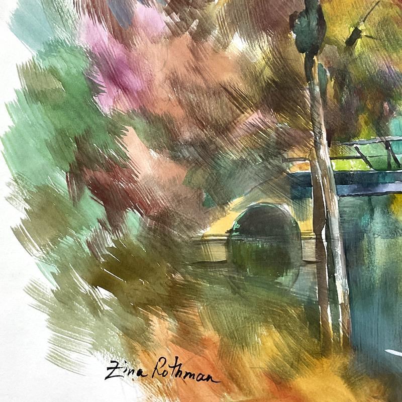 This is an original watercolor painting on paper by Zina Roitman, hand signed by the artist. Includes Letter of Authenticity. Measures approx. 26" x 16" (image). ** Please note: There is a small diagonal crease on the top-left corner of the paper. **