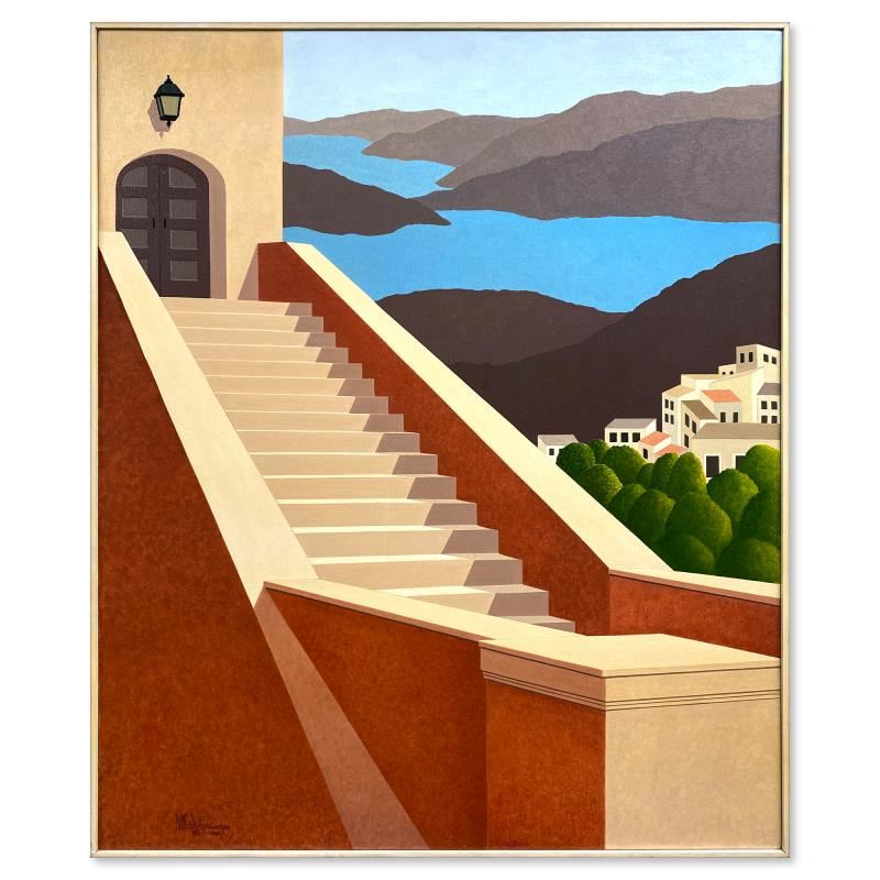 This is an original oil painting on canvas by William Schlesinger (1915-2011), dated 1986 and hand signed by the artist. This piece comes framed in a box frame; due to the age of the piece there is minor wear on the corners and edges of the frame. Includes Letter of Authenticity. Measures approx. 35.5" x 30" (frame), 36" x 30.5" (image).