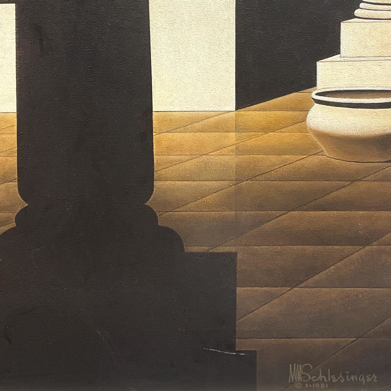 This is an original oil painting on canvas by William Schlesinger (1915-2011), dated 1981 and hand signed by the artist. This piece comes framed in a box frame; due to the age of the piece there is minor wear on the corners and edges of the frame. Includes Letter of Authenticity. Measures approx. 42.5" x 36.5" (frame), 42" x 36" (image). There are minor scuffs on the image, specifically on the top-left part of the canvas and to the left of the signature. **