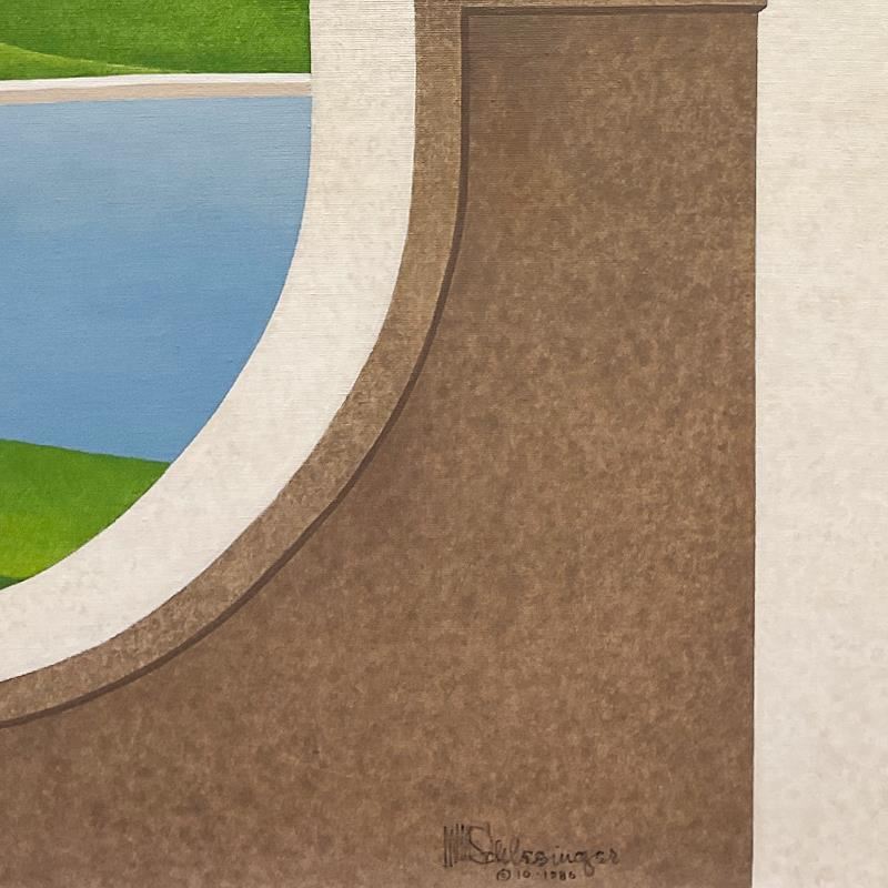 This is an original oil painting on canvas by William Schlesinger (1915-2011), dated 1986 and hand signed by the artist. This piece comes framed in a box frame; due to the age of the piece there is minor wear on the corners and edges of the frame. Includes Letter of Authenticity. Measures approx. 40.5" x 48.5" (frame), 40" x 48" (image). There are minor scuffs on the image that are only visible upon close inspection.
