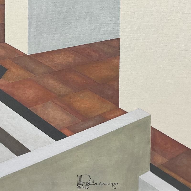 This is an original oil painting on canvas by William Schlesinger (1915-2011), dated 1980 and hand signed by the artist. This piece comes framed in a box frame; due to the age of the piece there is minor wear on the corners and edges of the frame. Includes Letter of Authenticity. Measures approx. 60.5" x 48.5" (frame), 60" x 48" (image).