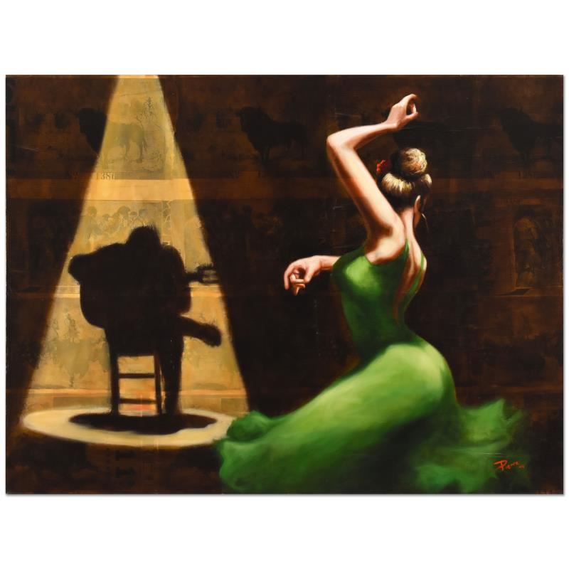 This is an original painting on gallery wrapped canvas by David Silva, hand signed using the nom de plume, Pierre. The artist uses a technique in which he fuses a base layer of paper on top of the canvas before applying oil paint. Includes Letter of Authenticity. Measures approx. 48" x 36" (image). Please note: there is minor wear on the corners and edges.